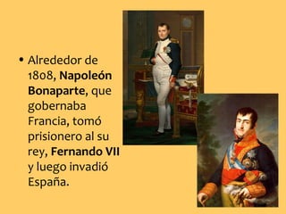 La revolución y la independencia en el Virreinato del Río de la Plata comenzaron cuando Napoleón invadió España en 1808 y tomó prisionero al rey Fernando VII. Esto llevó a la formación de juntas de gobierno en las ciudades españolas que gobernaron en nombre del rey. En 1810, un grupo de criollos en Buenos Aires formó la Primera Junta y declaró la independencia del virreinato, desconociendo la autoridad del virrey. Luego, la guerra de independencia enfrentó a los ejércitos criol