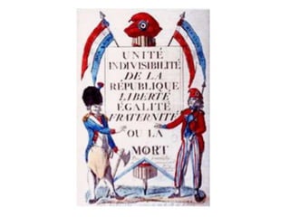 Este documento proporciona información sobre la Revolución Francesa en varias oraciones. Explica que la Revolución Francesa comenzó debido a una profunda crisis económica y social en Francia a finales del siglo XVIII, lo que llevó a la apertura de los Estados Generales en 1789 y el comienzo de la revolución. Luego describe las tres fases principales de la revolución: la monarquía constitucional de 1789 a 1792, la república democrática de 1792 a 1794 y la república burguesa de