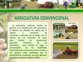 La agricultura moderna simplifica los ecosistemas y altera los suelos mediante prácticas como el monocultivo y el uso intensivo de tecnologías. Aunque esta revolución ha aumentado la producción agrícola, también ha causado impactos ambientales negativos, incluyendo la contaminación y la pérdida de biodiversidad. Es crucial encontrar un equilibrio entre la producción de alimentos y la conservación del medio ambiente para evitar mayores daños ecológicos.