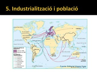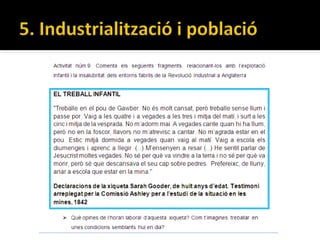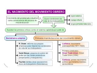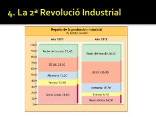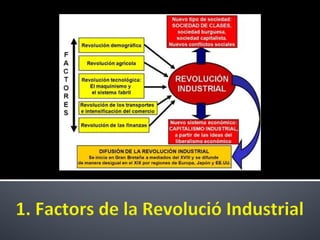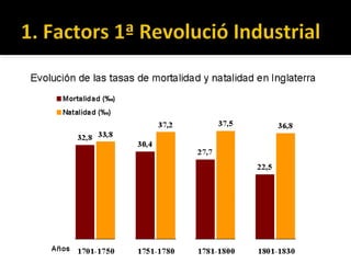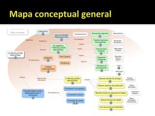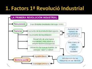 La Revolución Industrial comenzó en Gran Bretaña debido a varios factores como el crecimiento de la población, la revolución agrícola, y el nuevo contexto político y económico. Llevó a la mecanización y al sistema de fábricas, con innovaciones como la máquina de vapor. Se expandió a otros países de forma gradual y llevó grandes cambios sociales como el éxodo rural y el dominio de la burguesía en las ciudades.