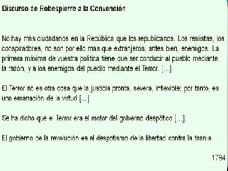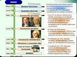 La Revolución Francesa se caracterizó por tener antecedentes políticos como el absolutismo y una sociedad estamental que impedía la movilidad social, causas directas como el descontento del Tercer Estado, y etapas como la caída de la monarquía y el establecimiento de la República. Generó cambios en Europa que marcaron el paso a la era moderna basada en ideas ilustradas como la soberanía popular.