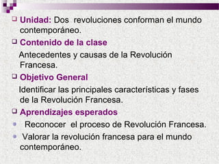 La Revolución Francesa ocurrió entre 1789-1799 y marcó el inicio de la era contemporánea. Fue causada por crisis económicas y políticas bajo el régimen de la monarquía absoluta. Comenzó con los Estados Generales y terminó con el golpe de Napoleón. Pasó por fases como la Asamblea Nacional Constituyente que abolió los derechos feudales, la Convención Nacional que ejecutó al rey y estableció una república, y el Directorio que estableció una constitución moderada. La