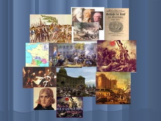 La Revolución Francesa ocurrió entre 1789 y 1799 y transformó Francia de una monarquía absoluta a una república. Las causas incluyeron deudas del estado, descontento del pueblo con los privilegios de la nobleza y el clero, y las ideas de la Ilustración. En 1789, los Estados Generales se convirtieron en la Asamblea Nacional y tomaron la Bastilla, marcando el inicio de la Revolución. Luego aprobaron la Declaración de los Derechos del Hombre y del Ciudadano y establecieron