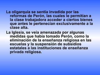 Durante el período peronista, había un conflicto cultural entre la oligarquía y la clase trabajadora. La revolución del 55 derrocó a Perón, e impuso una política de "desperonización" bajo gobiernos militares. Esto llevó a violencia política hasta que asumió Frondizi en 1958, pero fue derrocado en 1962 por permitir la participación de candidatos peronistas, a pesar de sus esfuerzos por la democracia.