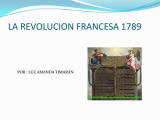 La Revolución Francesa comenzó en 1789 debido a varias causas ideológicas, sociales, políticas y económicas como el pensamiento de la Ilustración, la desigualdad social, la crisis de la monarquía absoluta y la bancarrota financiera. Se desarrolló en varias etapas clave que incluyeron la Asamblea Nacional, la Convención, el Directorio y la era napoleónica. Los principales protagonistas fueron filósofos como Voltaire, Rousseau y Montesquieu, así como revolucionarios como