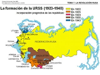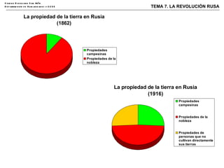 El documento describe la sociedad y el gobierno de la Rusia zarista, caracterizado por una extrema polarización social, una monarquía absoluta y un campesinado que vivía en condiciones miserables. A pesar de sus grandes recursos naturales, Rusia tenía un gran retraso económico y social. Tras la abolición de la servidumbre en 1861, la mayoría de la población continuó viviendo en la pobreza. Esto creó las condiciones para el surgimiento de ideologías revolucionarias.