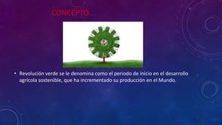 La Revolución Verde fue un período de desarrollo agrícola sostenible que comenzó en 1960 y aumentó significativamente la producción de alimentos a nivel mundial. Fue iniciada por Norman Borlaug a través del uso de variedades mejoradas de cultivos, fertilizantes y plaguicidas. Consistió en el monocultivo de maíz, trigo y otros granos usando nuevas tecnologías que maximizaron la productividad pero también causaron daños ambientales.