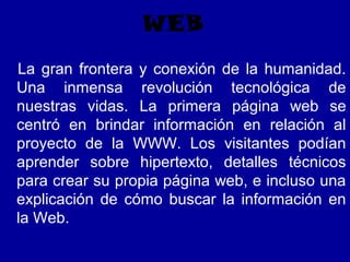 El documento habla sobre los orígenes y desarrollo de Internet. Sir Tim Berners-Lee creó la World Wide Web en 1989 mientras trabajaba en el CERN, revolucionando la transferencia de información a través de la creación del hipertexto y las páginas web. Otras figuras como Bill Gates, Mark Zuckerberg, y Stewart Brand también contribuyeron al desarrollo de las tecnologías de la información a través de empresas como Microsoft y organizaciones pioneras en comunidades en línea. Si bien la Web permitió una mayor comunicación global, también dio lugar a des