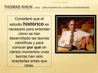 El documento resume la teoría de las revoluciones científicas de Thomas Kuhn. Kuhn argumentó que la ciencia progresa a través de paradigmas y períodos de ciencia normal, crisis, revoluciones científicas, y el establecimiento de un nuevo paradigma. Cuando un paradigma ya no puede resolver problemas persistentes, entra en crisis y nuevos paradigmas compiten hasta que uno es aceptado a través de una revolución científica.