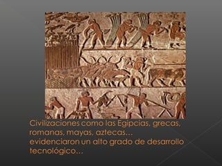 Este documento discute varios temas relacionados con el trabajo, incluyendo si solo los haraganes son pobres, si todo trabajo garantiza una vida digna, y si es posible trabajar honestamente en un mundo con pocas oportunidades. También resume brevemente las revoluciones tecnológicas desde la Edad de Piedra hasta la electrónica y nanotecnología, y plantea preguntas sobre si las personas trabajan para vivir o viven para trabajar.