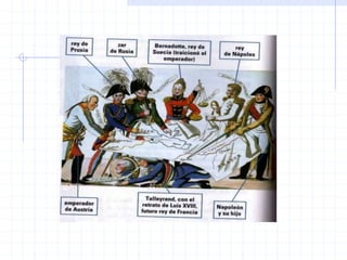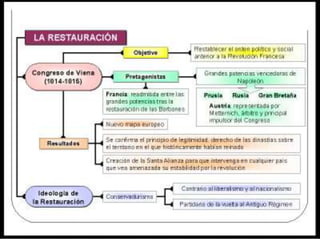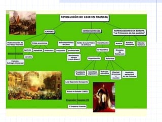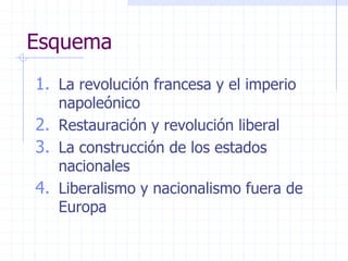 Este documento resume los principales eventos y conceptos relacionados con el liberalismo y el nacionalismo en Europa durante el siglo XIX, incluyendo la Revolución Francesa, el Imperio Napoleónico, las revoluciones liberales de 1820, 1830 y 1848, y la unificación de Italia y Alemania en 1870.