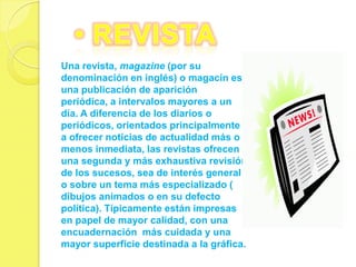 Las revistas se publican con periodicidad mayor a un día y ofrecen una revisión más exhaustiva de los sucesos que los periódicos. Históricamente, las primeras revistas incorporaron una gran variedad de material de interés para los lectores. Hoy en día, las revistas cubren una amplia gama de temas y son uno de los medios escritos más populares entre diversos grupos.