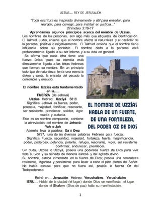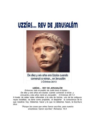 El documento describe la vida del rey Uzzías de Jerusalén. Uzzías comenzó a reinar a los 16 años y reinó por 52 años, buscando a Dios y haciendo lo recto. Esto le permitió prosperar bajo la protección divina. El documento también analiza el significado del nombre de Uzzías y de Jerusalén, exhortando al lector a comenzar a reinar sobre su naturaleza pecaminosa y vivir en paz como los habitantes de la ciudad de Jerusalén.