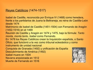 Los Reyes Católicos, Isabel de Castilla y Fernando de Aragón, unificaron a España a través de su matrimonio en 1469 y la conquista de Granada en 1492. Gobernaron de 1474 a 1516 y centralizaron el poder real, establecieron la Inquisición, expulsaron a los judíos y musulmanes, y completaron la Reconquista con la toma de Granada. También patrocinaron el viaje de Cristóbal Colón en 1492 que resultó en el descubrimiento de América.