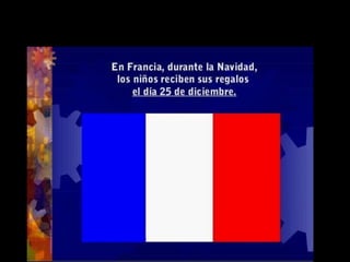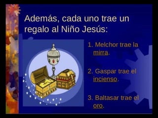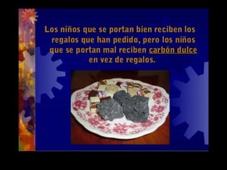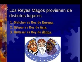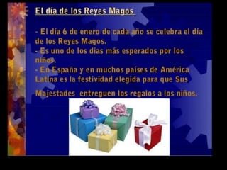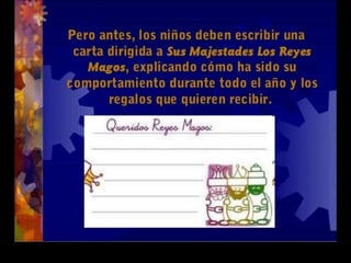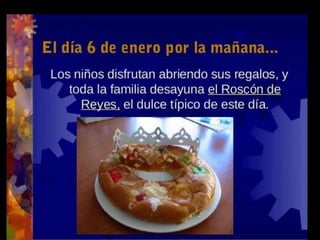 El documento describe las tradiciones del Día de Reyes en México, incluyendo las cabalgatas donde los Reyes Magos reparten regalos desde carrozas y los niños dejan ofrendas para los Reyes y sus camellos, así como la costumbre del roscón de reyes que contiene figuritas y un haba, quien encuentra el haba debe pagar el pastel.