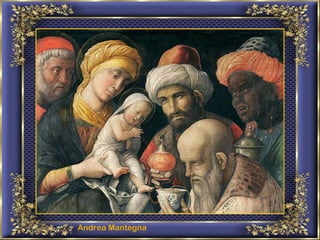 Este documento presenta un powerpoint sobre los Reyes Magos en el arte. Brevemente describe el origen bíblico de los Reyes Magos en el Evangelio de Mateo y cómo han sido representados por artistas a través de los siglos, incluyendo pinturas y esculturas de figuras como Botticelli, Bosch y Velázquez. Finalmente anima a los lectores a celebrar la Epifanía siguiendo el ejemplo de los Reyes Magos para ser mejores personas.