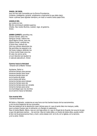 El documento contiene varias oraciones católicas. La primera oración pide protección y guía al ángel de la guarda. La segunda oración es a Jesús y pide fortaleza a través de sus sufrimientos. La tercera oración es de la Madre Teresa y pide tiempo para actividades como rezar, reír y amar. La cuarta oración, del Cardenal Newman, pide consuelo y una muerte pacífica a través de los sacramentos de la Iglesia.