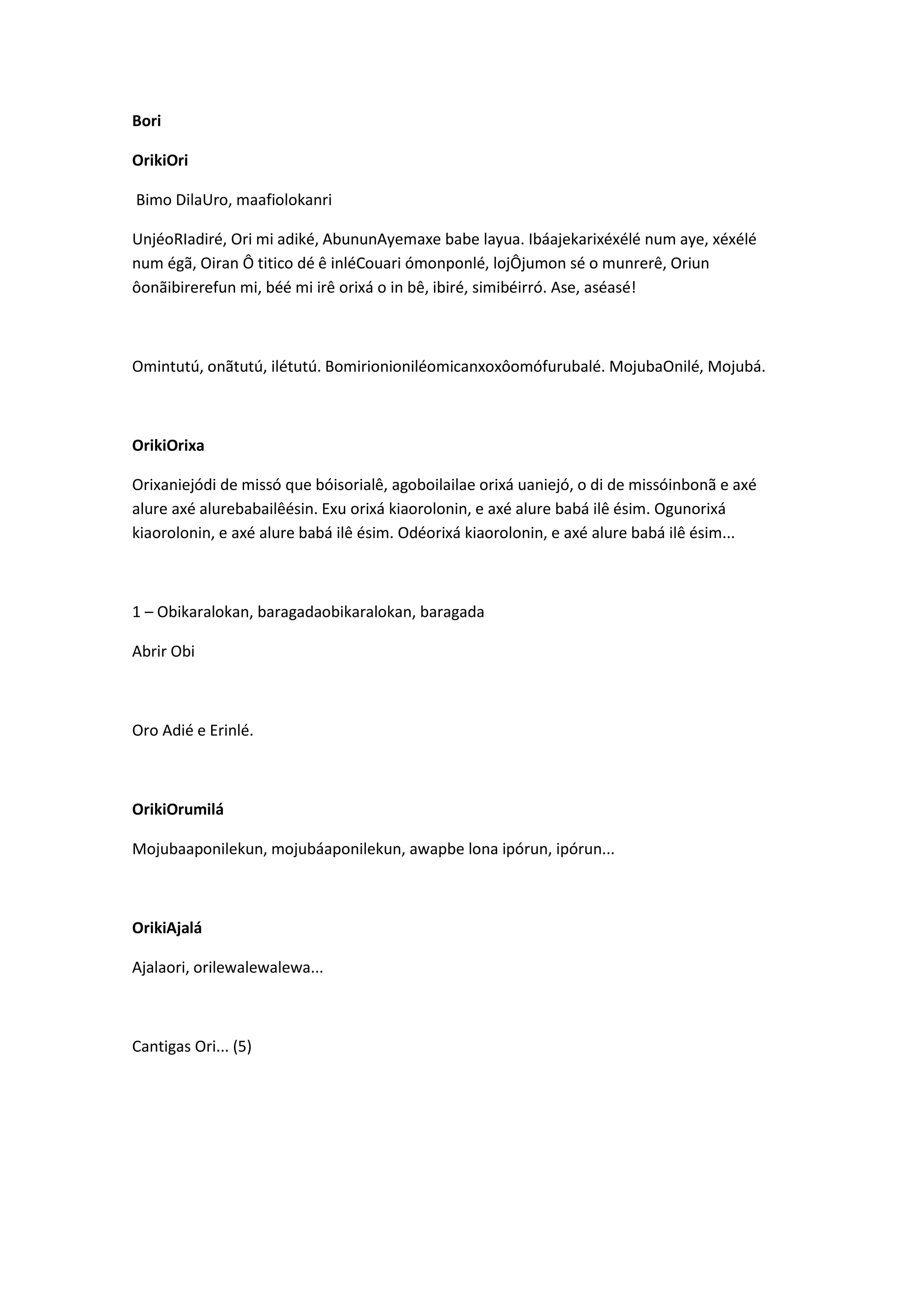Este documento contiene varios orikis o poemas de alabanza dirigidos a diferentes orixás (deidades) de la religión Yoruba. En menos de 3 oraciones, resume los orikis dedicados a Bori, Orixa, OrikiOrixa, OrikiOrumilá y OrikiAjalá, así como menciona que incluye 5 cantigas ori adicionales.