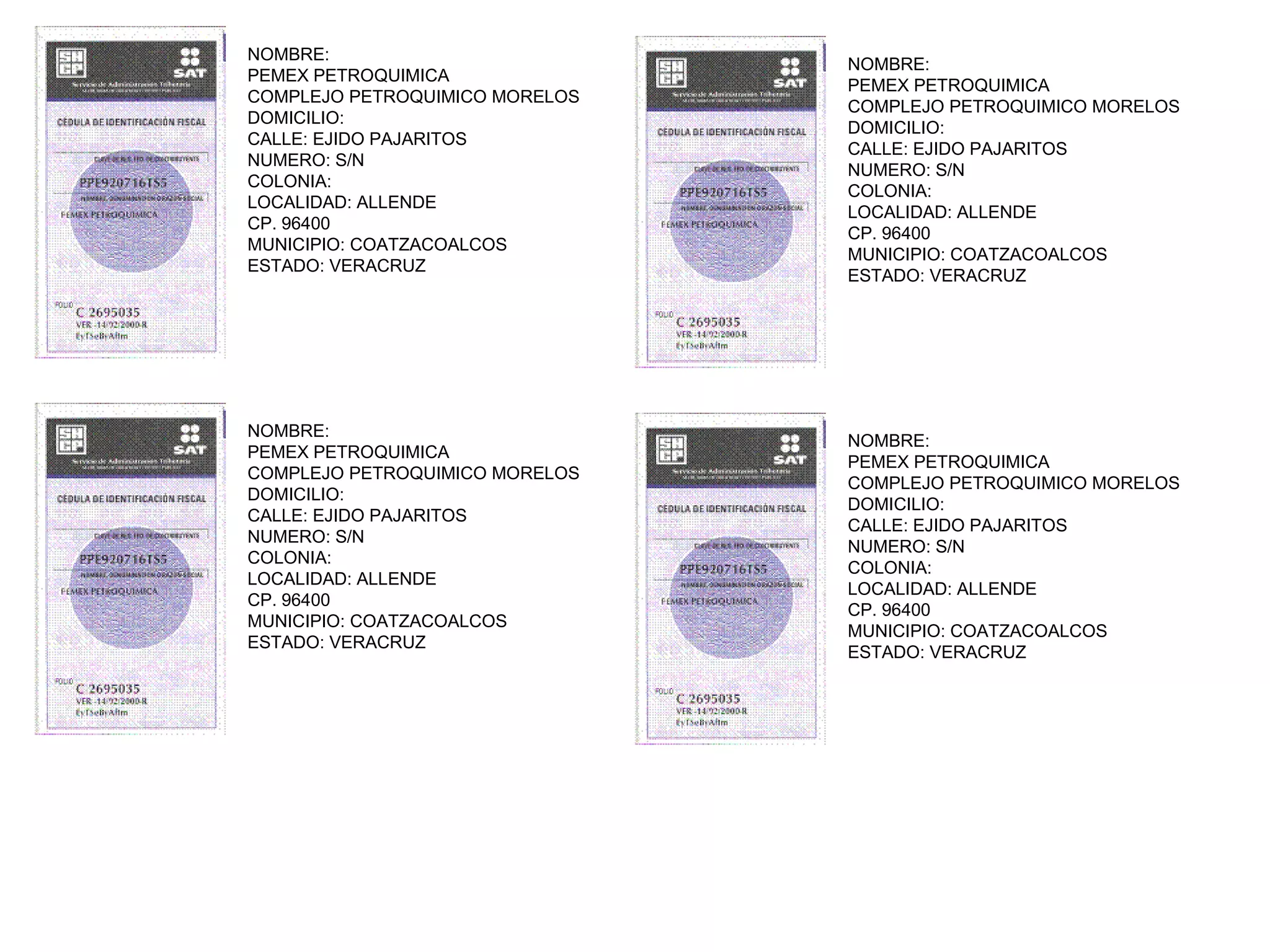 El documento proporciona la información de contacto repetida cuatro veces para PEMEX PETROQUIMICA COMPLEJO PETROQUIMICO MORELOS ubicado en EJIDO PAJARITOS S/N, LOCALIDAD ALLENDE, COATZACOALCOS, VERACRUZ CP 96400.