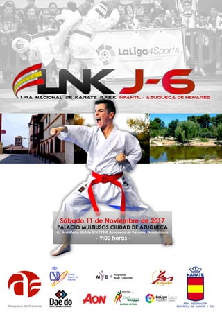 Este documento anuncia la segunda ronda de la Liga Nacional de Karate Infantil que se celebrará el 11 de noviembre de 2017 en Azuqueca de Henares, Guadalajara. La liga está abierta a competidores de categorías benjamín, alevín, infantil y juvenil con licencia federativa vigente. Se competirá en katas y kumites individuales masculinos y femeninos en diferentes categorías de peso.