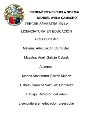 El documento resume una reflexión sobre un video titulado "JUGAR A PENSAR" que muestra las estrategias de una maestra en el aula preescolar. La maestra crea un ambiente de aprendizaje centrado en el niño, adecua las actividades a su edad y contexto, e incentiva actitudes positivas. Implementa los momentos de acción, interacción, formulación y validación propuestos por Bruseaur para que los niños exploren, interactúen y validen sus conclusiones.