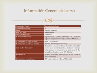 John Fredy Olaya Restrepo, vigilante y estudiante del curso de Estructuras de Datos bajo la dirección del Ing. Hermes Mosquera, se formará en temas de gestión dinámica de memoria y estructuras de datos utilizando C++. El curso incluye prácticas de laboratorio, un examen final y diversas actividades, con la evaluación total de 500 puntos. Los estudiantes deben alcanzar al menos 300 puntos para aprobar, y se realizarán consultas bibliográficas para apoyar el aprendizaje.