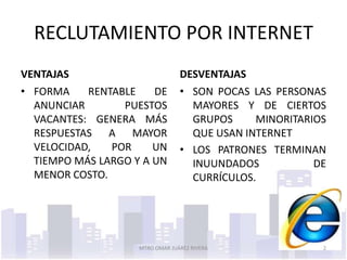 El documento presenta las ventajas y desventajas del reclutamiento por internet, diferentes tipos de anuncios y agencias de empleo, y estrategias para reclutar una fuerza laboral más diversa como padres solteros, trabajadores mayores, mujeres y grupos minoritarios.
