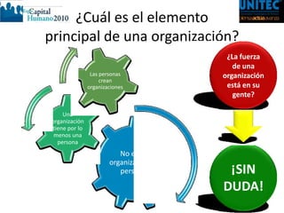 Este documento discute el cambio de enfoque en la administración de recursos humanos hacia la administración del capital humano. Explica que las personas son el elemento principal de una organización y que el enfoque debe cambiar de ver a los empleados como un costo a verlos como creadores de valor. También analiza cómo el entorno laboral ha cambiado a uno más turbulento y cómo esto requiere enfoques nuevos para atraer y retener el talento.