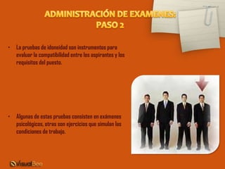 La entrevista de selección consiste en una conversación formal conducida para evaluar la idoneidad del solicitante para el puesto. Incluye etapas como la preparación del entrevistador, la creación de un ambiente de confianza, el intercambio de información y la evaluación final del candidato. El resultado final del proceso de selección es la contratación del personal más adecuado para cada puesto.