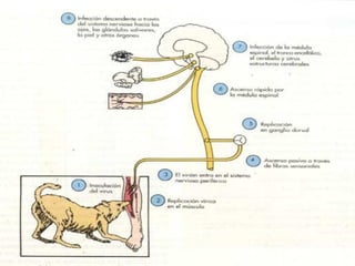El documento proporciona información sobre la taxonomía, estructura, propiedades, ciclo de vida, epidemiología, patogenia, clínica y diagnóstico del virus de la rabia. El virus de la rabia pertenece al orden Mononegavirales, familia Rhabdoviridae y género Lyssavirus. Se transmite principalmente por mordedura y su periodo de incubación puede variar de días a meses.
