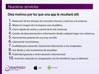El documento detalla los servicios ofrecidos por Rhappsody Technologies, destacando la mejora en la comunicación y gestión empresarial a través de aplicaciones móviles. Se mencionan características como geolocalización, integración con redes sociales y notificaciones push, que facilitan la interacción con clientes y empleados. Además, se enfatiza la adaptabilidad de sus desarrollos y el compromiso con la satisfacción del cliente.