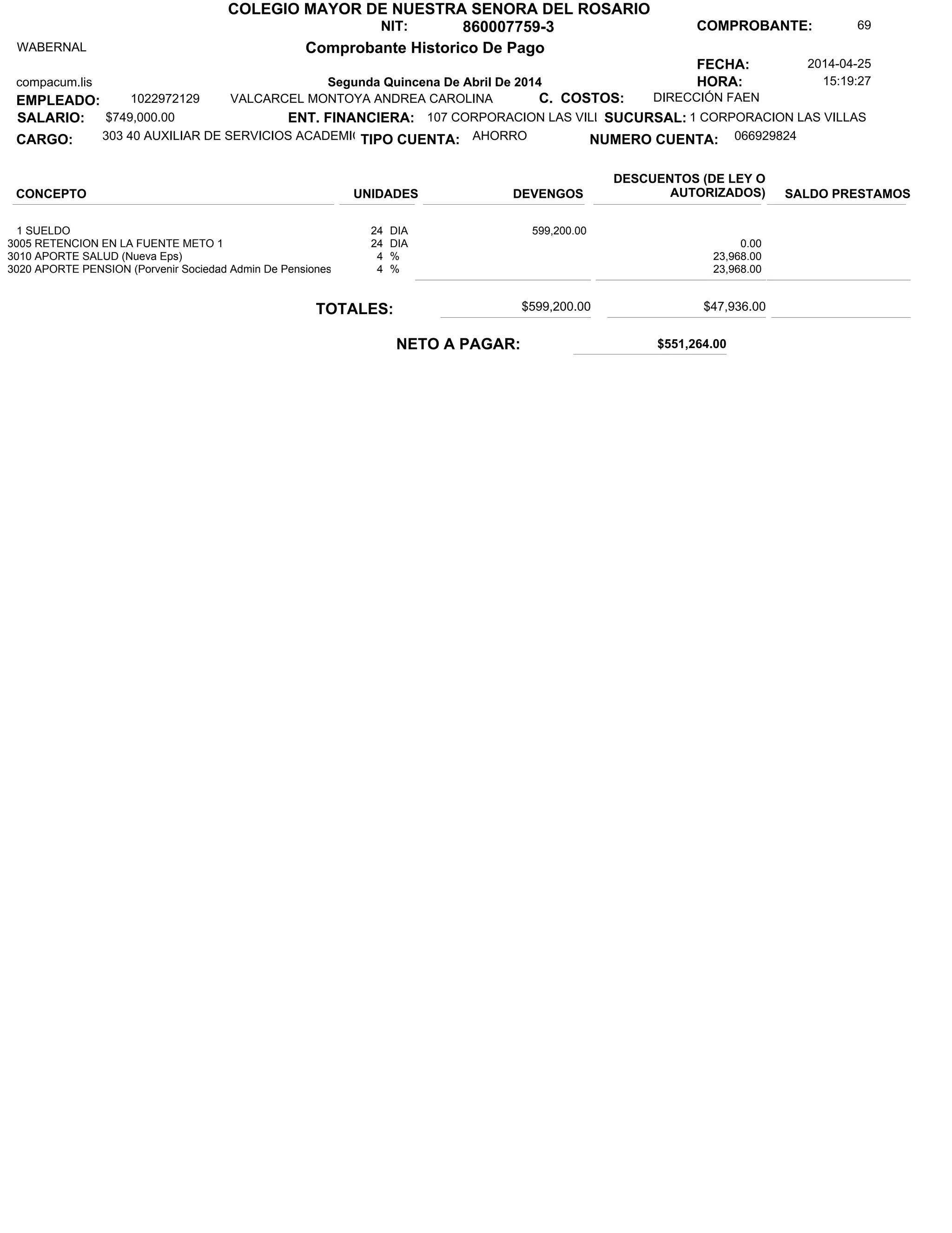 Este documento es un comprobante de pago que detalla los devengos, descuentos y saldo neto a pagar de un empleado. Se muestra el salario de $749,000, con descuentos de $23,968 que incluyen retención en la fuente, aportes de salud y pensión. El saldo neto a pagar al empleado es de $551,264.