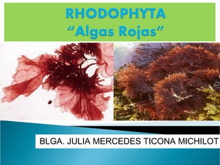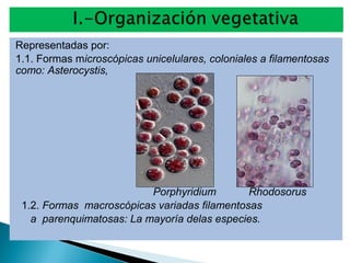 Este documento describe las características de las algas rojas (Rhodophyta). Describe su morfología, incluyendo formas microscópicas y macroscópicas, así como detalles sobre su pared celular, rizoides, reproducción y ciclos de vida. También cubre su taxonomía, ecología, usos e importancia económica.