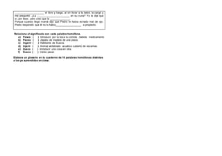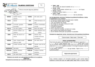 Este documento presenta varias palabras homófonas en español y sus significados. Incluye pares como bienes-vienes, pollo-poyo, cien-sien, cima-sima, hierba-hierva, asesinada-acecinada, revelar-rebelar, y boto-voto. También incluye una sección de práctica con oraciones que usan estas palabras homófonas y un ejercicio sobre palabras homófonas adicionales.