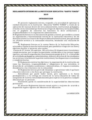 Este documento presenta el Reglamento Interno de la Institución Educativa “Santo Tomás” para el año 2019. Consta de 7 títulos y 28 capítulos que regulan la organización, funcionamiento y gestión pedagógica, administrativa e institucional de la escuela, así como los deberes y derechos de los estudiantes, docentes y personal. El reglamento tiene como objetivo establecer las normas y procedimientos para garantizar una educación de calidad a la comunidad educativa de acuerdo a la ley.