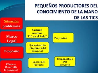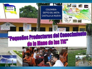 Este documento describe un proyecto que usa las TIC para apoyar la educación en una escuela rural. El proyecto involucra salidas pedagógicas con estudiantes para aprender sobre la economía local, así como alfabetizar a los padres en el uso de las TIC. El proyecto ha logrado mayor participación de estudiantes, padres y la comunidad, así como reconocimientos.