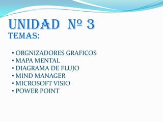 Este documento presenta diferentes tipos de organizadores gráficos como mapas conceptuales, diagramas de flujo, ruedas de atributos y sus usos. También describe herramientas digitales como MindManager, Microsoft Visio y PowerPoint que permiten crear estos organizadores gráficos de manera digital. Finalmente, explica conceptos como organigramas y SmartArt que son útiles para representar la estructura de organizaciones.