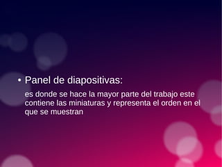 Este documento describe los diferentes tipos de vistas en PowerPoint. El panel de diapositivas muestra las miniaturas de las diapositivas y su orden. El modo normal es el modo de trabajo principal para crear y editar diapositivas. El modo notas muestra las diapositivas como una lista con viñetas para tomar notas de apoyo. Las transiciones definen los efectos especiales entre diapositivas durante una presentación.