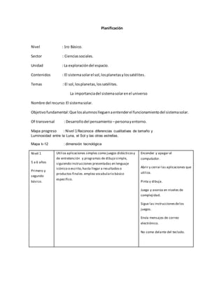 El documento presenta una planificación para una unidad sobre el sistema solar dirigida a estudiantes de primer grado básico. La unidad abarca temas como el sol, los planetas y los satélites, y tiene como objetivo principal que los estudiantes comprendan el funcionamiento del sistema solar. La planificación describe las diferentes secciones de la unidad, que incluyen actividades como ver videos, identificar elementos en imágenes, buscar información en internet, y realizar una presentación y evaluaciones.