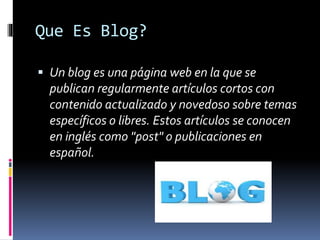 El documento habla sobre blogs, incluyendo qué es un blog, sitios para crear uno, las diferencias entre un blog y una página web, ventajas y desventajas de los blogs, y lo que se requiere para crear un blog. Explica que un blog es una página web donde se publican regularmente artículos sobre temas específicos, y lista diez sitios populares donde se puede crear un blog.