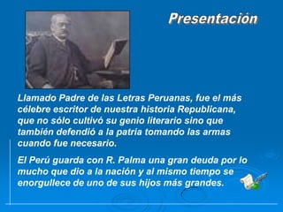 Ricardo Palma fue el escritor más importante de la historia de Perú, conocido principalmente por sus Tradiciones Peruanas. Trabajó como bibliotecario y reconstruyó la Biblioteca Nacional de Perú sin recursos. Palma también fue periodista, poeta, dramaturgo y patriota peruano perseverante que investigó la historia y cultura de Perú.