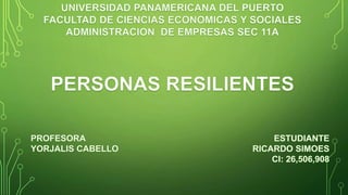 El documento discute la resiliencia, la cual originalmente se consideró una condición innata pero ahora se entiende que depende de factores individuales, familiares, comunitarios y culturales. Aunque la resiliencia implica estrés y malestar, permite que las personas sobrelleven la adversidad. Las personas resilientes tienden a pensar de manera realista y flexible, y cometen menos errores cognitivos.