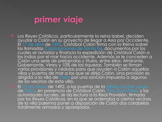 Los Reyes Católicos deciden financiar la expedición de Cristóbal Colón para llegar a Asia navegando hacia occidente. El 17 de abril de 1492, Colón firma las Capitulaciones de Santa Fe con la Reina Isabel, autorizando y financiando la expedición. Se le otorgan a Colón títulos como Almirante y el 10% de las riquezas obtenidas.