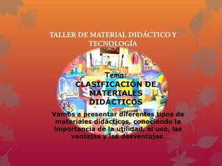 El documento presenta una clasificación de los diferentes tipos de materiales didácticos, incluyendo materiales permanentes como pizarrón y cuadernos, materiales impresos como libros y revistas, materiales gráficos como carteles y rotativos, material audiovisual como videos y películas, y material auditivo como grabadoras. Además, describe las ventajas y desventajas de cada tipo de material didáctico.