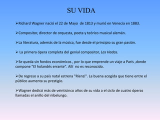 Richard Wagner (1813-1883) fue un destacado compositor, director de orquesta y teórico musical alemán, cuyas obras, como 'El anillo del nibelungo', marcaron un hito en la ópera. A pesar de enfrentar dificultades económicas y falta de reconocimiento inicial, logró consolidar su prestigio con estrenos exitosos. Su uso del leitmotiv y la complejidad musical son características distintivas de su trabajo, que incluye títulos emblemáticos como 'Tristán e Isolda' y 'Los maestros cantores de Núremberg'.