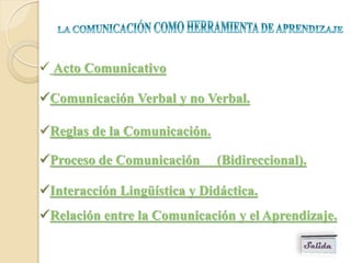 Este documento presenta información sobre la comunicación y el aprendizaje. Explica que existe una estrecha relación entre la comunicación y el aprendizaje, ya que para aprender se requiere comunicar información dirigida a lograr cambios en los estudiantes, sin importar su nivel educativo, edad u otras características. También presenta una cita de Robert Kiyosaki que destaca la importancia fundamental de las habilidades de comunicación como escribir, hablar y negociar para el éxito personal.