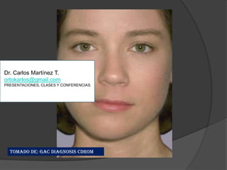 El documento presenta una guía sobre la cefalometría frontal de Ricketts. Explica cómo realizar un análisis cefalométrico frontal, incluyendo la identificación de puntos anatómicos, planos y medidas lineales y angulares utilizadas para evaluar la simetría facial, desviaciones de líneas medias y diagnóstico de casos pre y postquirúrgicos de forma complementaria al análisis tridimensional.