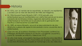 Este documento describe la historia, características y especies de Rickettsia, un género de bacterias intracelulares obligadas. Se menciona que Rickettsia prowazekii causa el tifus epidémico transmitido por piojos, Rickettsia typhi causa el tifus murino transmitido por pulgas, y Rickettsia rickettsii causa la fiebre manchada de las Montañas Rocosas transmitida por garrapatas. También se describen brevemente otras especies como Rickettsia akari, Rickettsia con