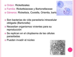El documento aborda las rickettsias, un grupo de bacterias parásitas intracelulares que requieren hospedadores vivos para su reproducción y causan diversas enfermedades como tifus y fiebre manchada. Se describen su estructura, patogenia, diagnóstico y epidemiología, así como distintas especies y sus respectivas manifestaciones clínicas. Además, se discute el tratamiento y la prevención de estas infecciones, destacando la importancia de la higiene y el control de vectores.