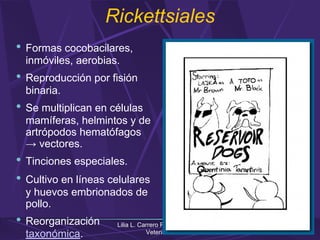 El documento describe la taxonomía, biología y patogénesis de las órdenes Rickettsiales y Anaplasmataceae. Estos son parásitos intracelulares obligados que infectan principalmente células sanguíneas y endoteliales. Incluyen géneros como Rickettsia, Orientia, Ehrlichia, Anaplasma, Neorickettsia y Wolbachia, los cuales tienen diferentes especies de importancia médica y veterinaria. Se transmiten principalmente por artrópodos hematófagos y causan en